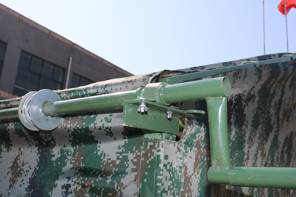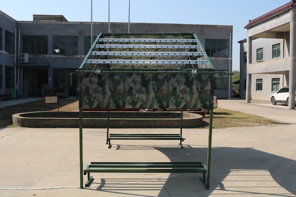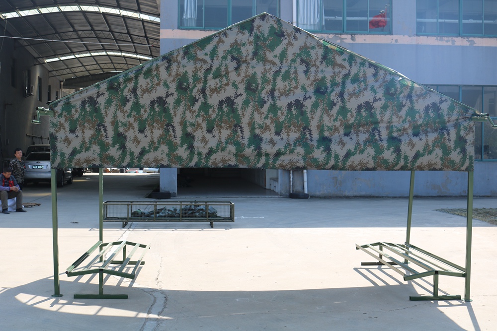 Size: 4. * 2 * 1.8 * 2.7mFabric: 07 digital camouflage Oxford cloth Structure: Frame structureMembers: Φ 38 * 38 * 1.5mm square tube Weight: 155kgPackaging size: 2 * 0.75 * 0.4m Accessories: Hammer, ground nail, shoe rack * 2 pieces