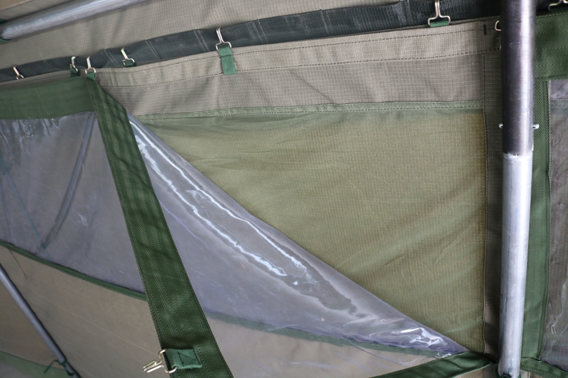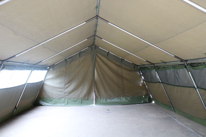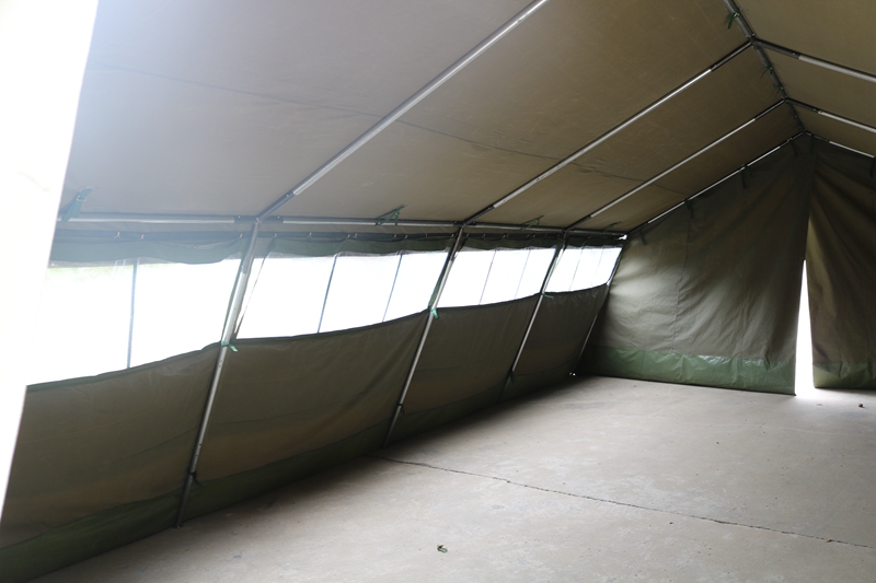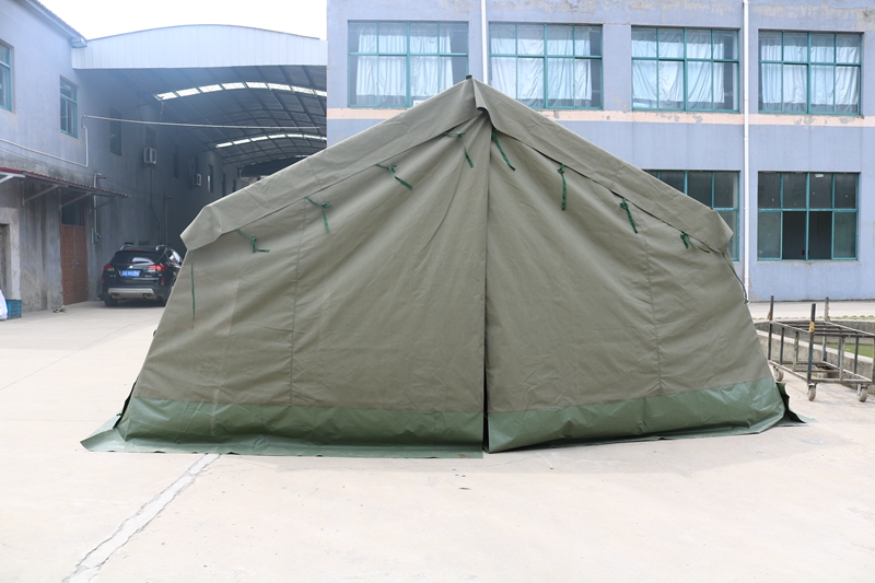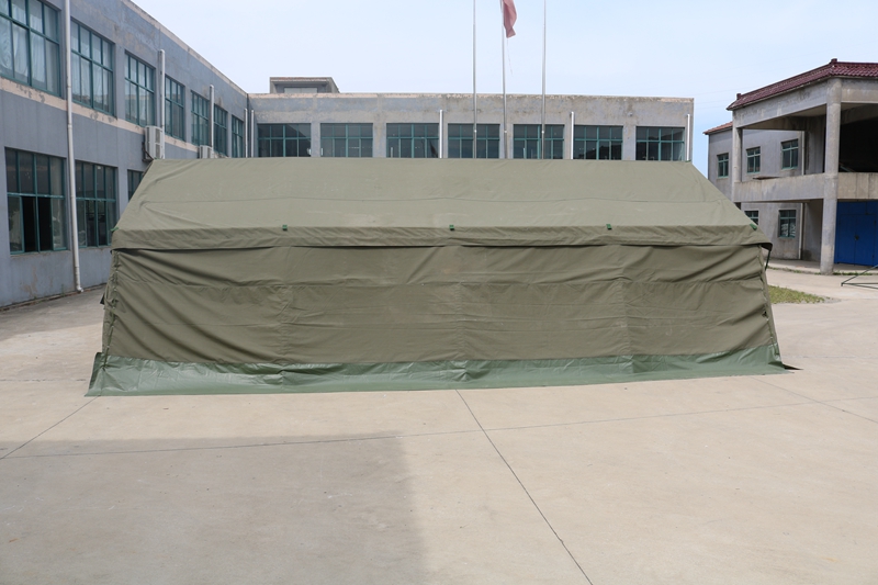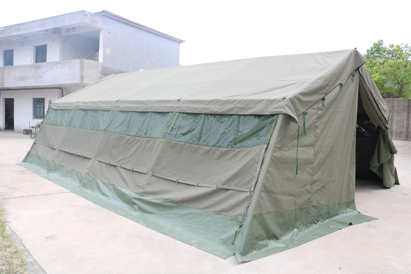 Size: 10 * 5 * 2 * 2.8mFabric: 380g military green waterproof polyester canvas Structure: Framework structurePackaging: 5 packages Weight: 210 kgAccessories: hammer, wind rope, ground pile