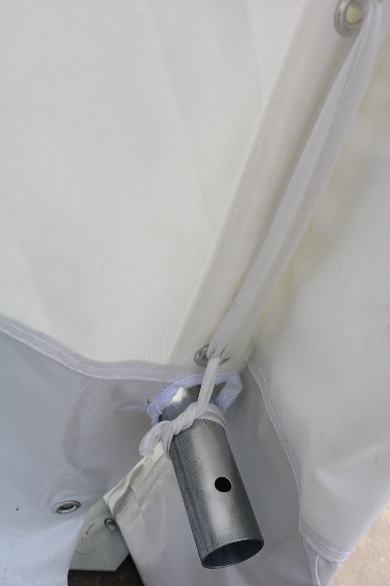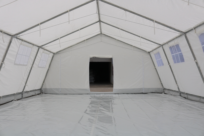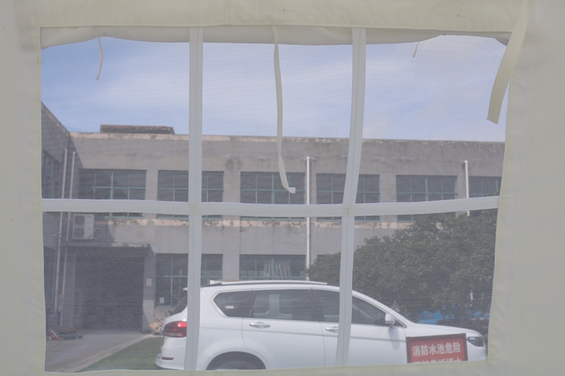 Tent size: 7.5 * 6 * 2 * 3mTent fabric: 600D white Oxford cloth Structure: Framework structureNeutral pole: φ 38 * 1.5 spray coated steel pipe Weight: 237kgPackaging size: 0.472m3 Accessories: Hammer, Ground Pile, Wind Rope