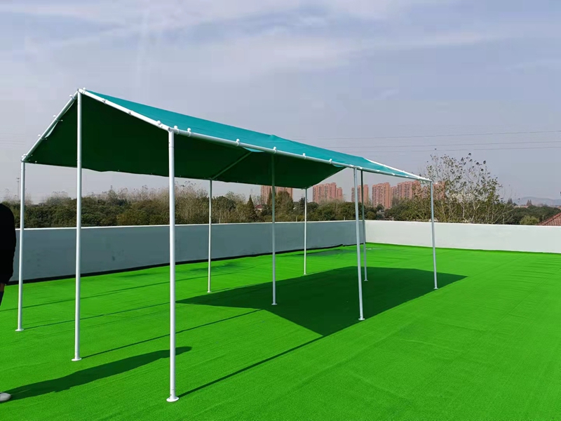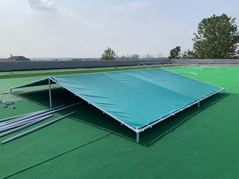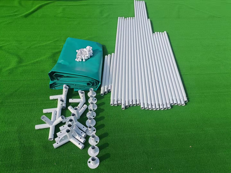Dimensions: 6.1 * 6.1 * 2.1 * 2.8m/6.1 * 12.2 * 2.1 * 2.8m Fabric: 550g blue PVC scraper cloth Structure: Framework support Rods: Ф 38mm * 1.5mm steel pipe Accessories: ground nails, hammers, rubber balls