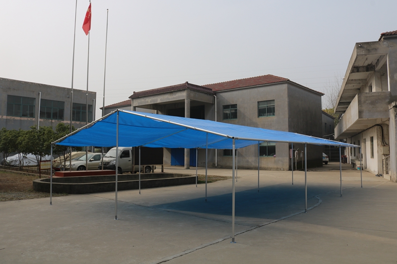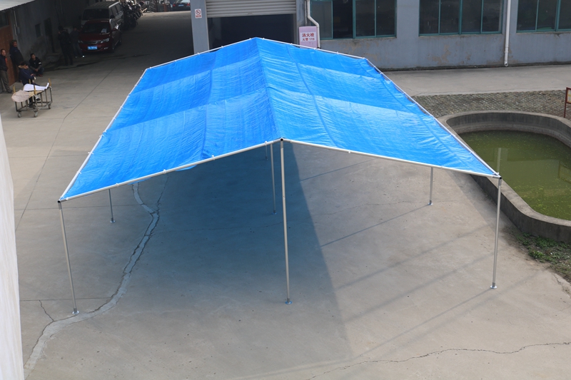 Size: 6 * 10m2 * 2.7Fabric: 220G blue PE fabric Structure: frame supportMember: aluminum alloy pipe Accessories: ground nails, hammers